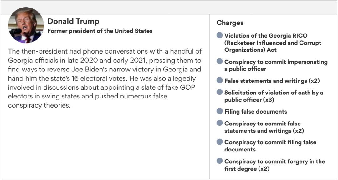 In a 41-count, 98-page indictment handed up Monday by a Fulton County grand jury, former President Donald Trump and 18 allies are accused of committing more than a dozen felonies while trying to overturn Trump’s defeat in Georgia’s 2020 election.